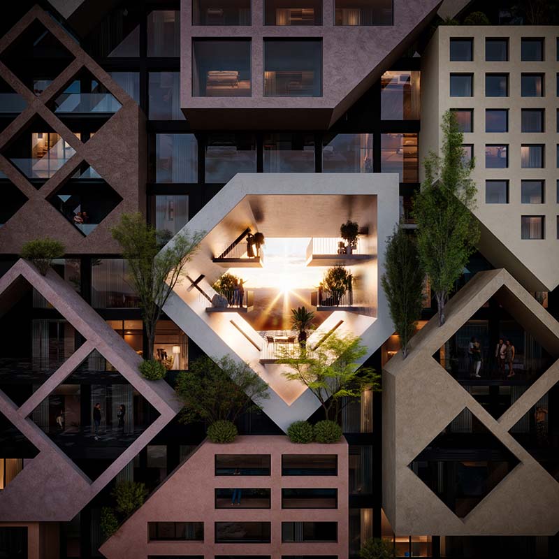 Los bloques apilados sobresalen de las fachadas de este rascacielos de uso mixto y 71 metros de altura representan la forma de “la casa de pueblo arquetípica con techo a dos aguas” de manera estilizada y estarán colocados en distintas posiciones, con sus techos apuntando hacia arriba, hacia los lados o hacia abajo, encajando unos con otros como la piezas de un puzle.