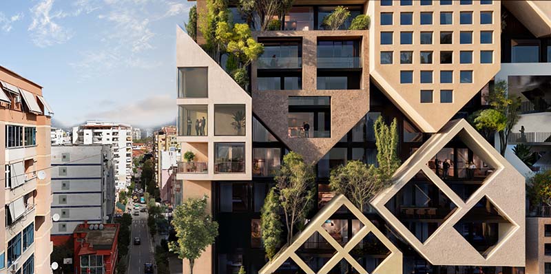 Este edificio, cuando se construya, sin duda llamará la atención y se convertirá en un punto destacado en el horizonte urbano de Tirana, capital de Albania. A primera vista parece una mezcla entre un ‘cubo de rubik’ a medio armar y un rompecabezas de piezas de madera en 3D, todo ello a escala gigantesca.