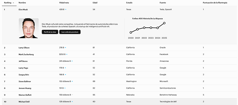 También hay un récord en lo más alto de la lista: Elon Musk es la primera persona en superar la barrera de los 400.000 millones de dólares en la lista Forbes 400. Es la persona más rica de Estados Unidos por cuarto año consecutivo, con una fortuna asombrosa de 428.000 millones de dólares, tras sumar 184.000 millones a su patrimonio gracias a la subida de las acciones de Tesla (que se han incrementado un 56%) y a 12 meses más de aumento de la valoración de su empresa privada de cohetes SpaceX y de su empresa de inteligencia artificial xAI. Musk aventaja en 152.000 millones de dólares al segundo clasificado, Larry Ellison, una suma mayor que todo el patrimonio neto de Warren Buffett.